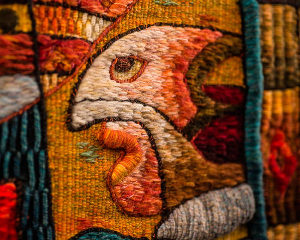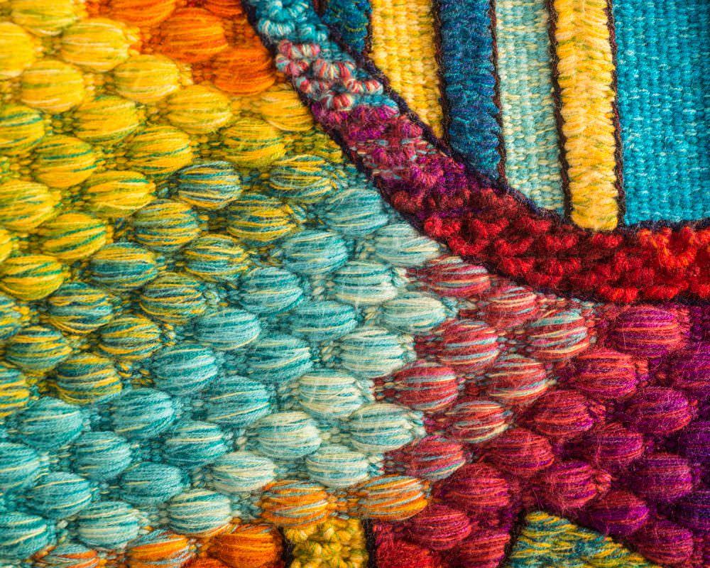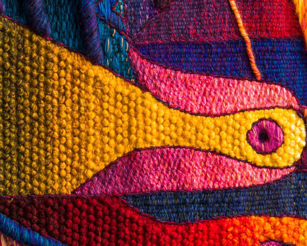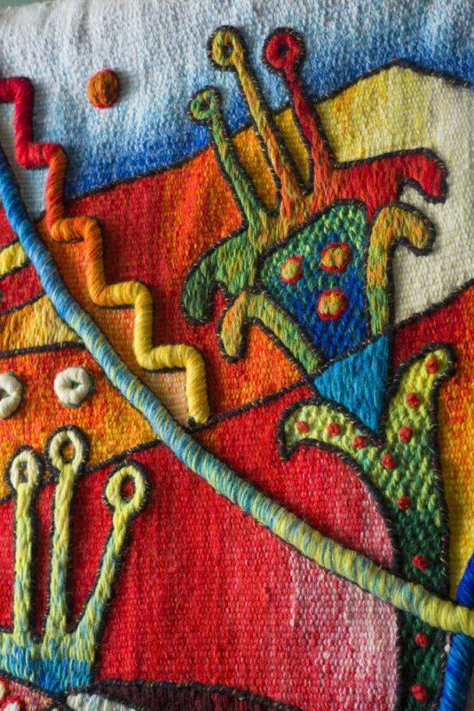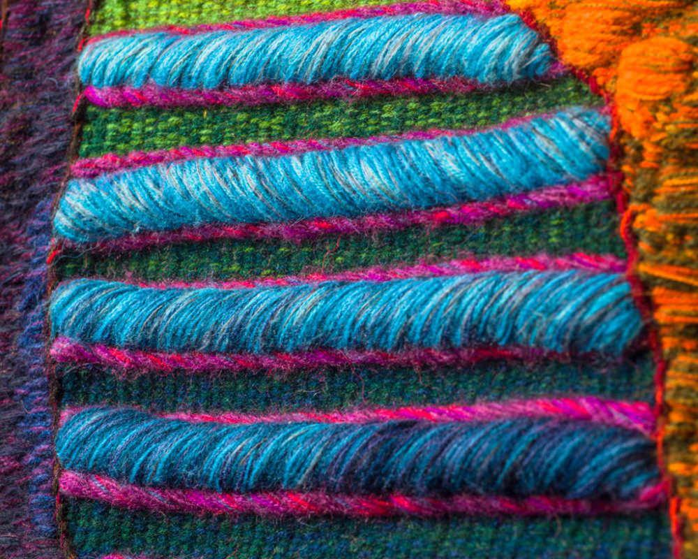 He combines ancient traditions from the Andes with contemporary tapestry weaving, as well as his own textured techniques, to create tapestries that are vibrant in color and in textures.