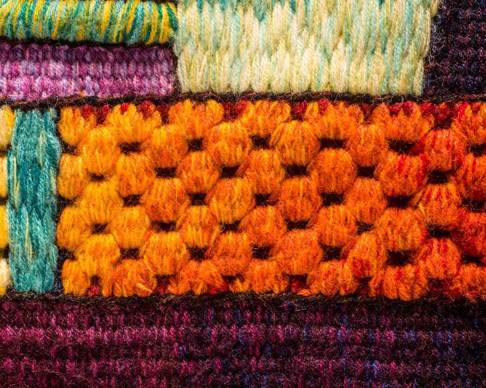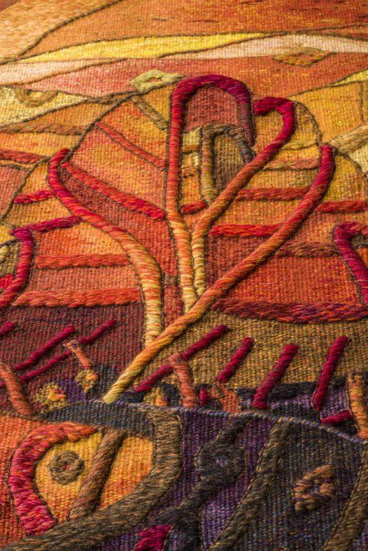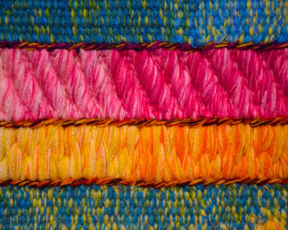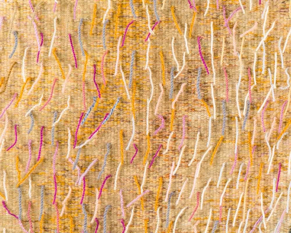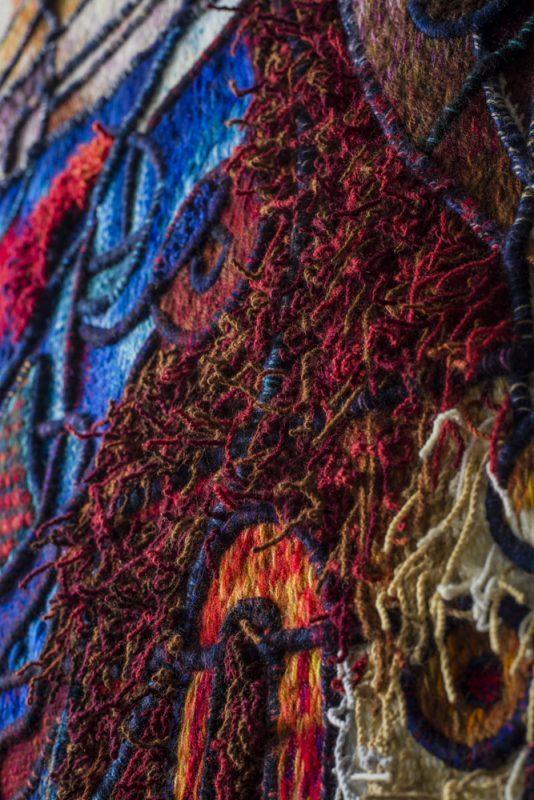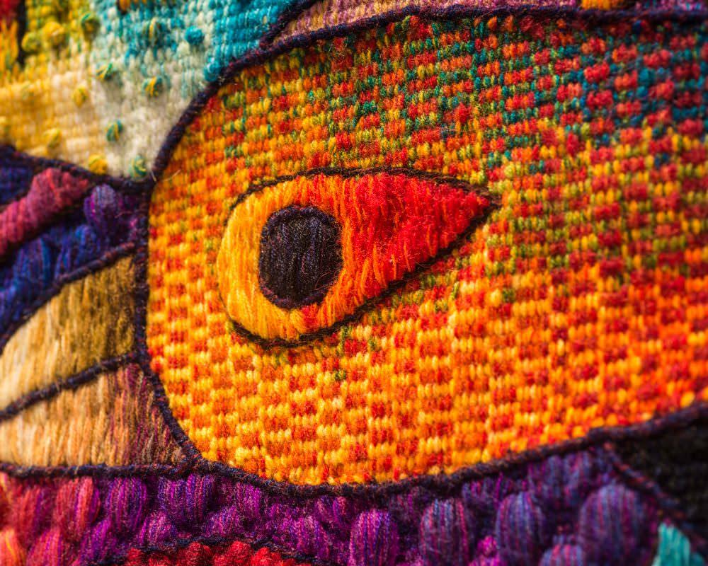 He combines ancient traditions from the Andes with contemporary tapestry weaving, as well as his own textured techniques, to create tapestries that are vibrant in color and in textures.