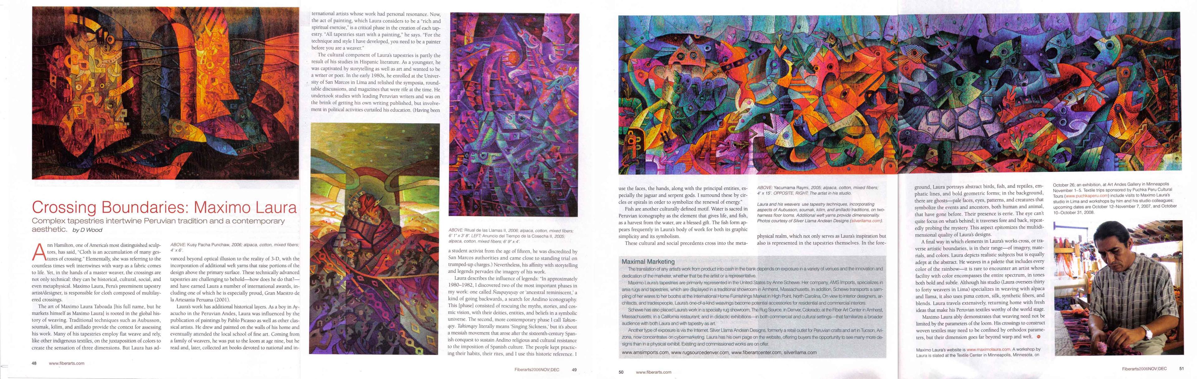 Ann Hamilton, one of America's most distinguished sculptors, has said, “Cloth is an accumulation of many gestures of crossing.” Elementally, she was referring to the countless times weft intertwines with warp as a fabric comes to life. Yet, in the hands of a master weaver, the crossings are not only technical: they can be historical, cultural, social, and even metaphysical. Maximo Laura, Peru’s preeminent tapestry artist/designer, is responsible for cloth composed of multilayered crossings.