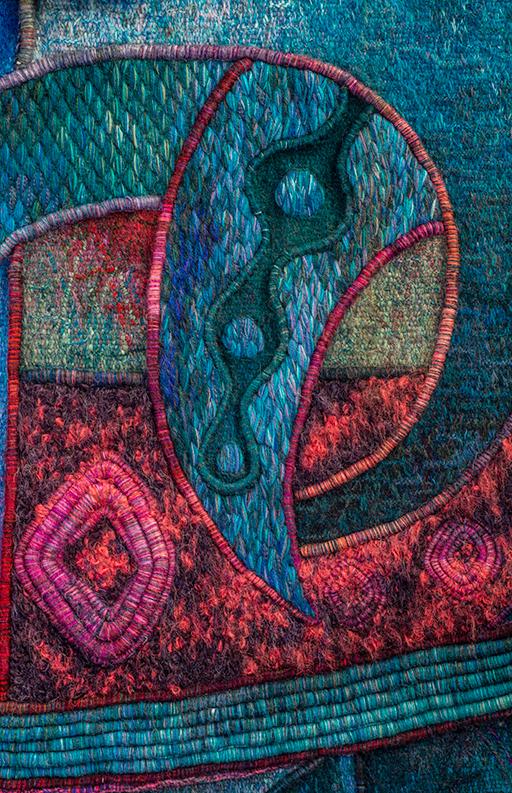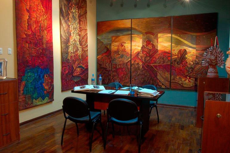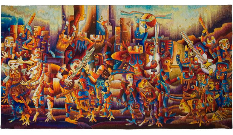 Maximo realizes that museum people are only interested in ancient Peruvian weaving, but he does not intend to enter into competition with the old ones. Nevertheless, elements of their culture are an important basis for his work. He has dedicated his whole life to weaving. At the age of seven, he began weaving in his father’s workshop and has always used his craft to make a living, even during his student days when he lived in Lima to study Spanish literature. In the city, he encountered the work of Argentinian weaving artist Helvecia Kela Cremaschi, who was living in the Peruvian capital at the time. It was she who showed him the expressive potential of weaving. Since then, he has devoted himself to weaving as his form of expression. In our conversations he mentioned the names of painters important to him: Fernando De Szyszlo and Gerardo Chaves in Peru, Roberto Matta in Chile, Rufino Tamayo in Mexico, and Alfredo Lam in Cuba. European painters are Paul Klee, Joan Miró, and Pablo Picasso. To my surprise, he enthusiastically sang the praises of Jean Lurcat, calling him a master with new visions and a great gift to humankind.